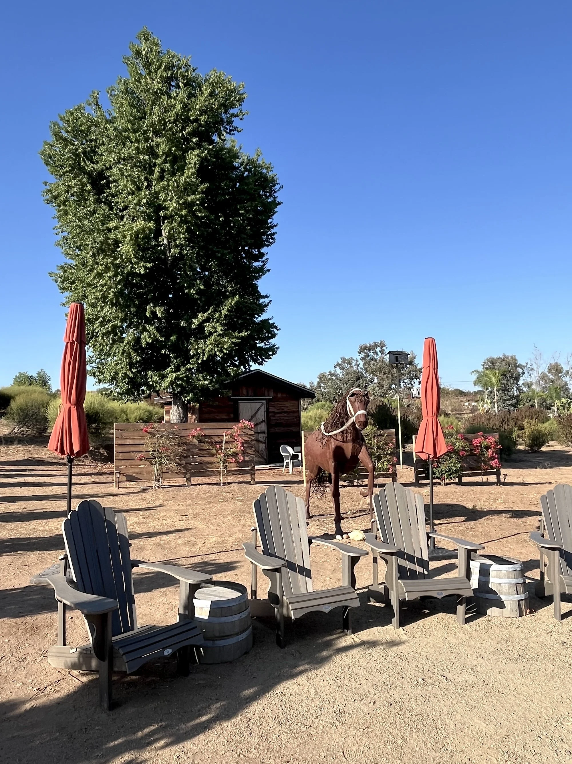 The winery is an easy place to chill. Everyone is conversing but the sound level is low, the horizons spacious. Live music is featured from time to time. The tables are glass-topped barrels with corks tucked under the glass. I take a walk around the grounds that contain some more outlying tables with umbrellas folded and a horse sculpture.