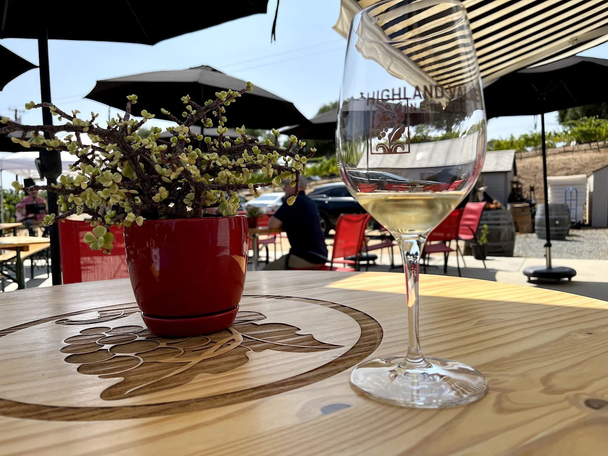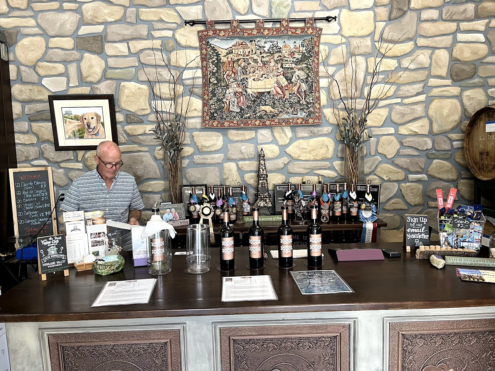 I pass several wineries before reaching Highland Valley Vineyards as it is the northernmost winery on Bandy Canyon Road. The vineyards sit on a slope and hug a Craftsman-styled house fronted by a tasting patio. There is a larger parking lot to the left of the road where I park and walk down the hill a bit to the winery. Entering the open-front tasting room, I meet owner Ray Schnorr. He and his spouse, Jeannine O’Brien, are the owners, farmers, and winemakers of this winery that features Bordeaux varietals. Ray sets me up for a tasting flight, the most popular experience at the winery. Tastings are $20 to taste six wines. (Glass pours are $15). He hands me extensive notes on the wines and food pairings written by Jeannine and pours the first wine in the structured tasting sequence, a Clairette Blanche.